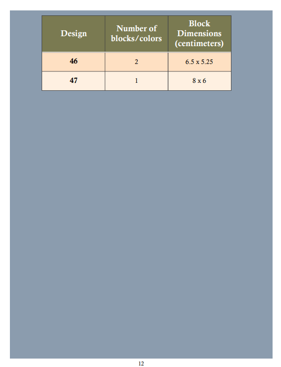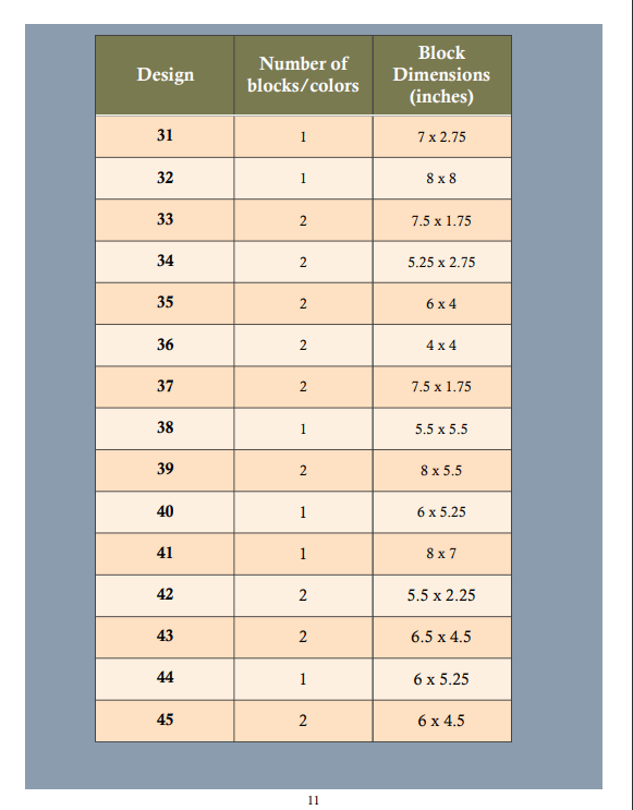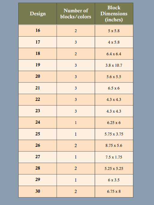 Our diverse collection includes designs that can be brought to life using a single block and color, as well as more intricate patterns that involve multiple blocks and colors. To determine the specific blocks and colors used for each design, please refer to the convenient chart provided at the end of this page. Remember, all colors can be tailored to your personal preferences.